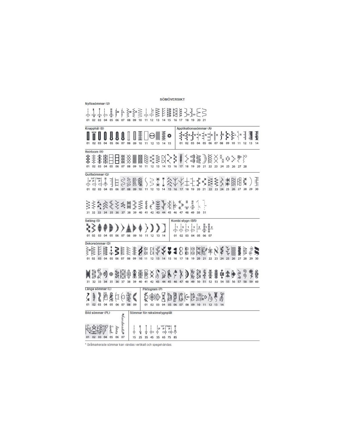Välj bland 300 olika sömmar från olika kategorier: nyttosömmar, knapphål, applikationsömmar, heirloomsömmar, quiltsömmar, satängsömmar (förlängningsbara upp till 5 gånger), övergångsömmar, dekorsömmar, långa sömmar, piktogram, lekfulla sömmar, bokstäver med symboler och siffror.