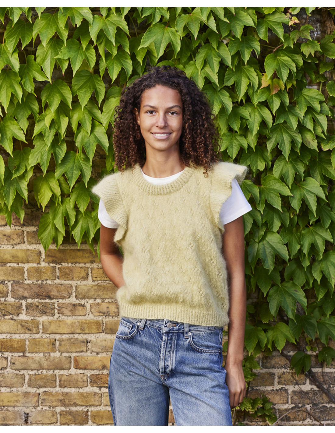 Stickbeskrivning till en snygg väst med volanger i garnet Bella. Västen stickas nedifrån och upp därefter stickas volangkanterna.