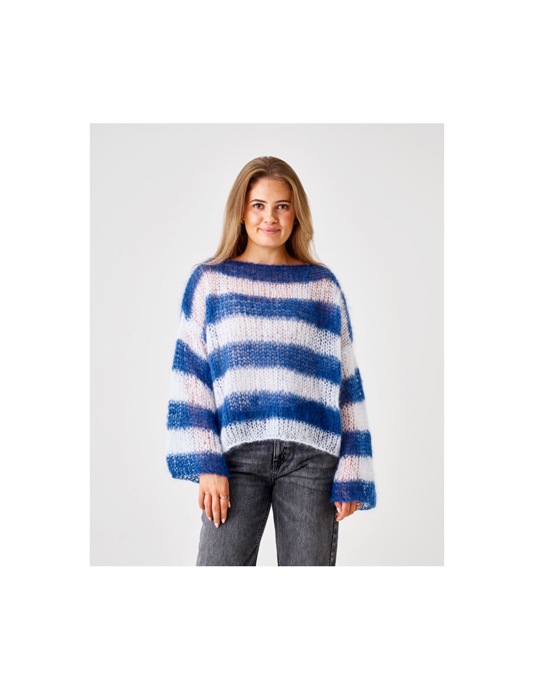 Stickbeskrivning till en snygg löst stickad tröja med ränder i garnet Bella. Tröjan stickas i slätstickning nerifrån och upp i fyra delar som sedan sys i hop