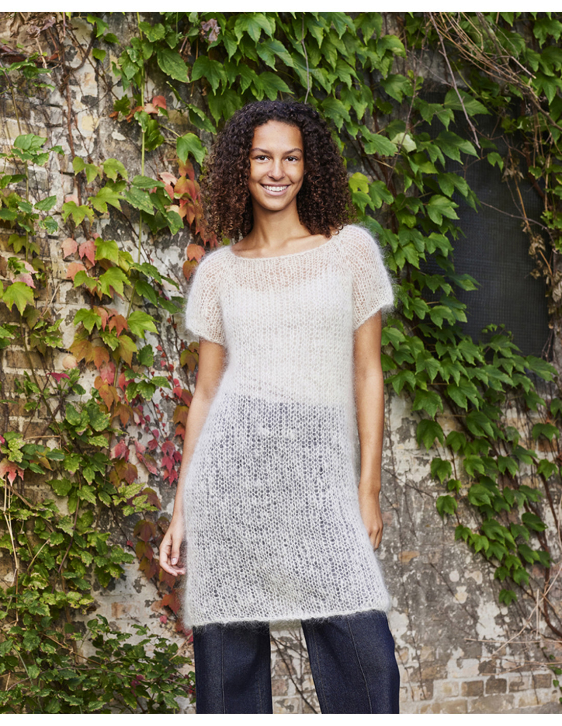 Stickbeskrivning till en snygg tunika i garnet Bellissima som är ett garn i mohair med lite glitter. Tunikan stickas uppifrån och ner med raglan och grova stickor.