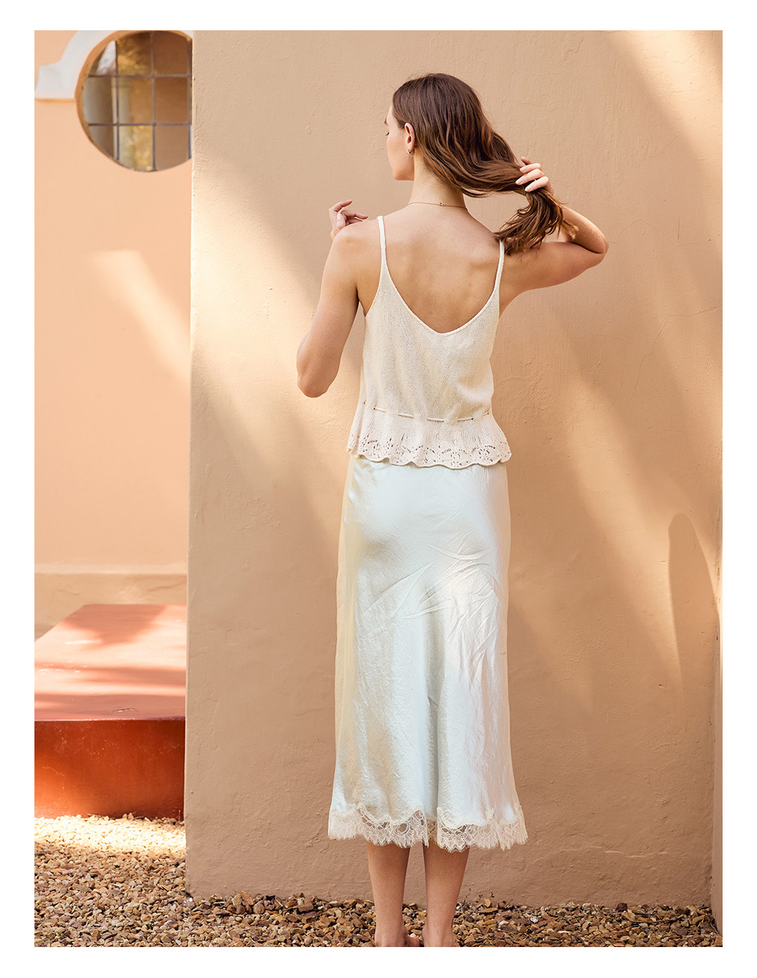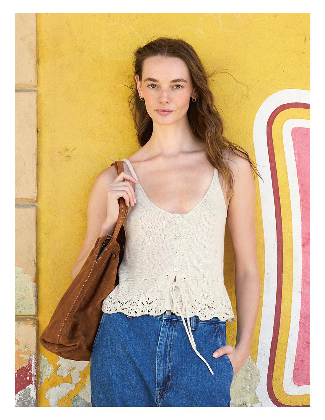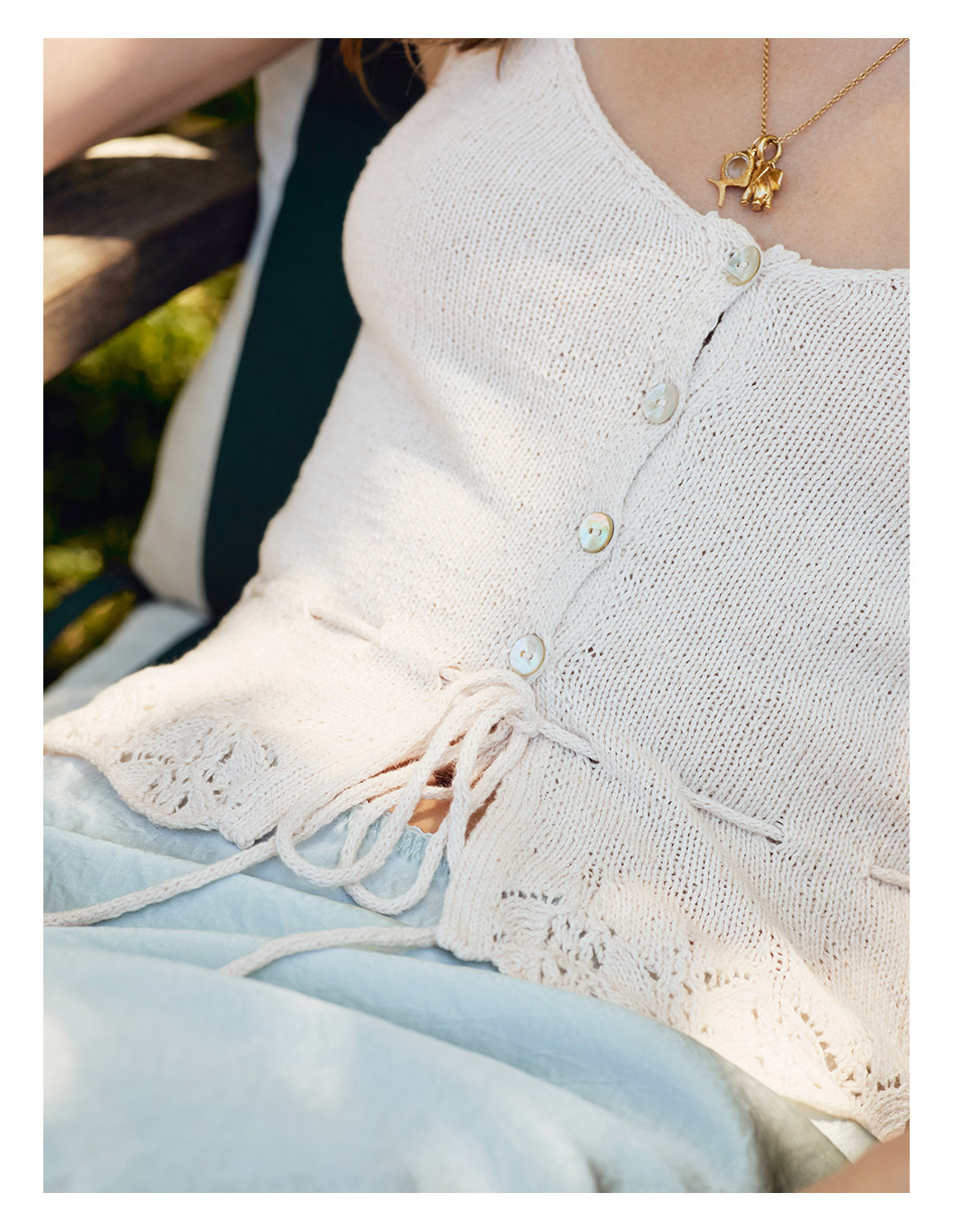 Toppen stickas nedifrån och upp med hålmönster och dubbelstickade kanter.
