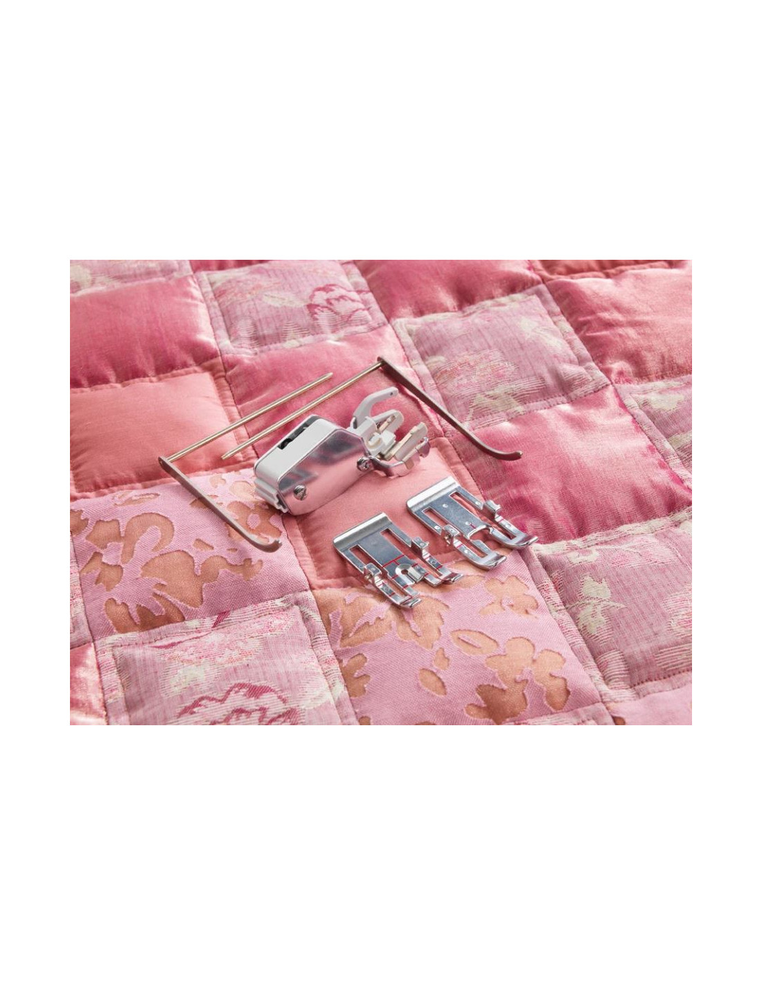 Den dubbla matarfoten med utbytbar pressarfötter är utformad för att mata lager av tyg och/eller vadd jämnt. Den är perfekt för quiltning, sömnad av sammet, stretchiga tyger, läderimitationer och tyger som kräver exakt mönstermatchning.